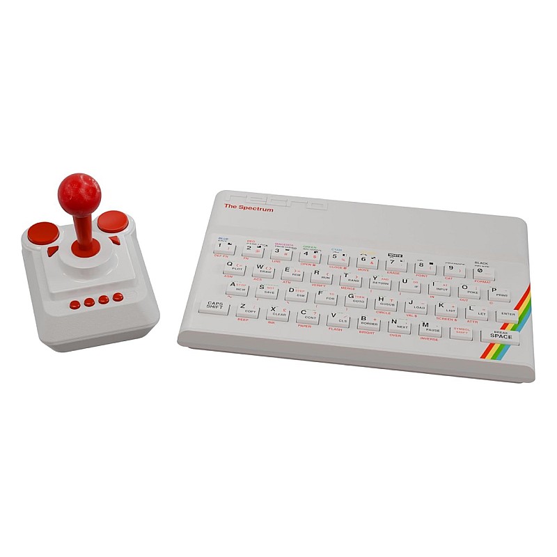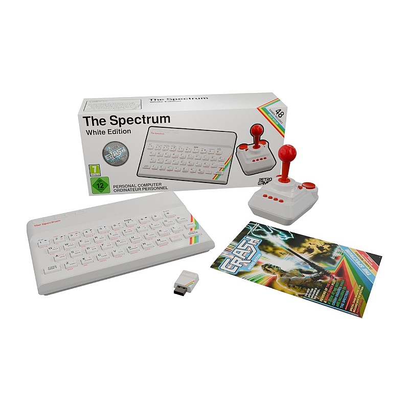 Pachetul include Spectrum, joystick-ul THEJOYSTICK cu 8 butoane, unitatea flash USB THEMICRODRIVE și încărcătorul CRASH.