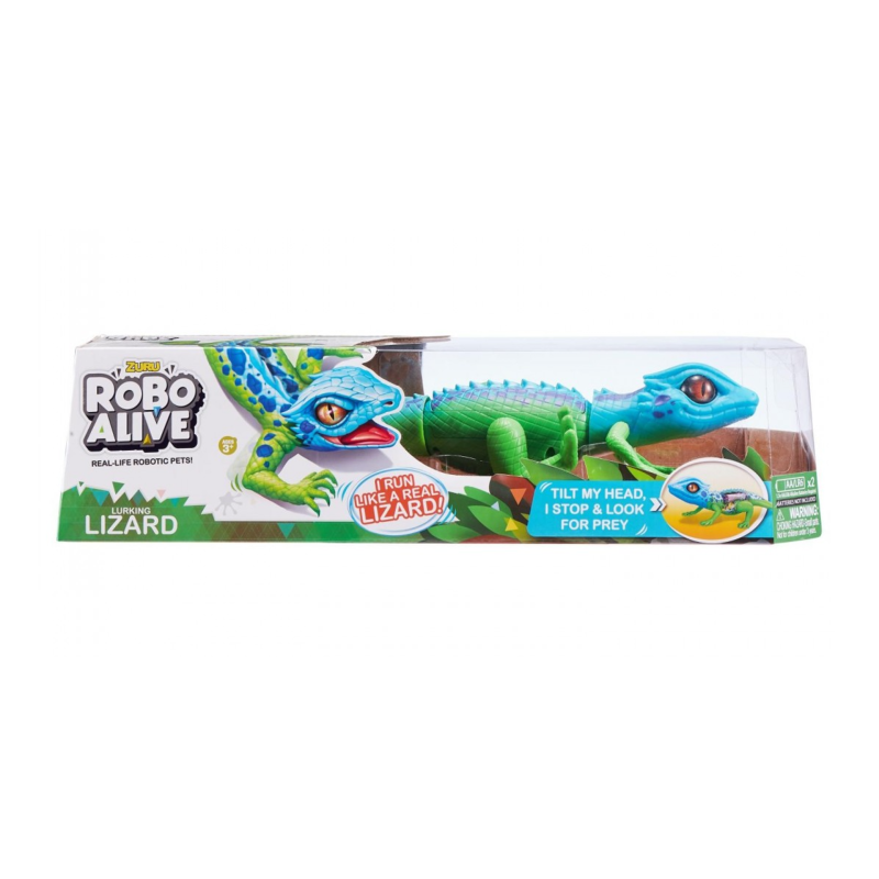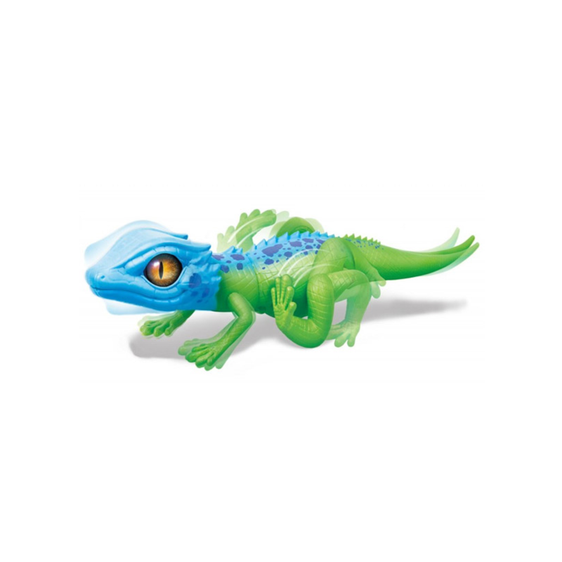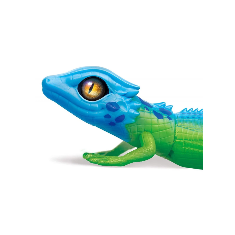 Șopârlă interactivă de culoare verde-albastră cu ochi frumoși de culoare maro. Capul și coada jucăriei sunt realizate din cauciuc flexibil și moale, iar trunchiul este fabricat din plastic rezistent.