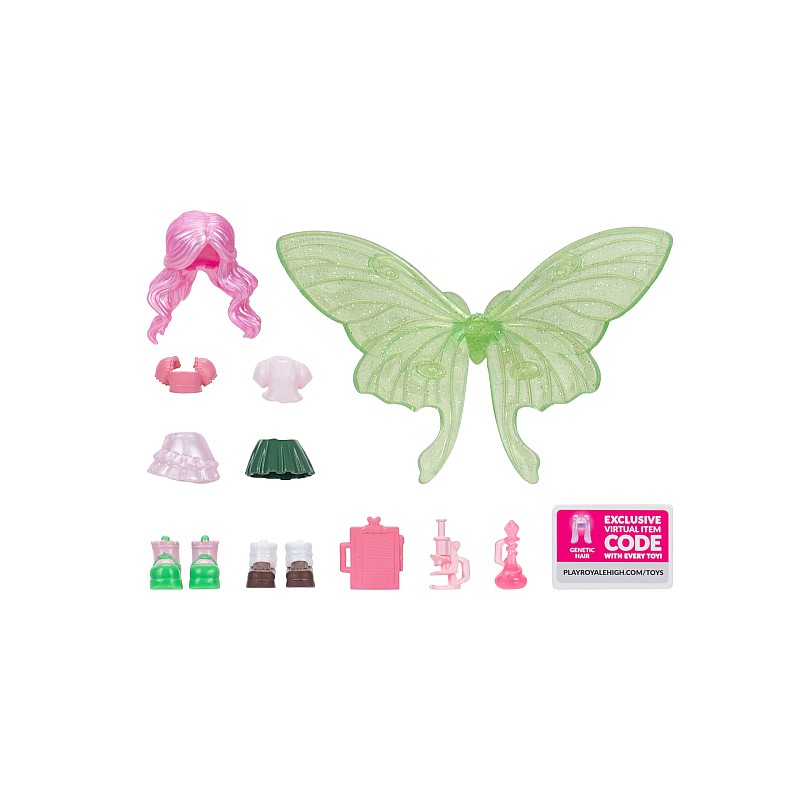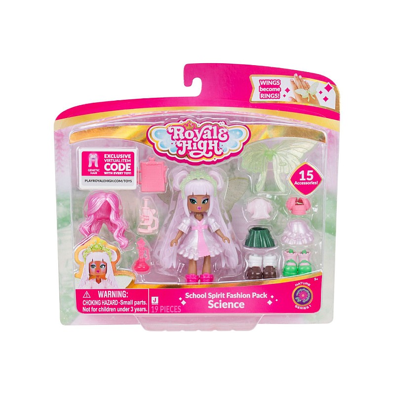Science School Spirit Fashion Pack conține 3 ținute, 3 perechi de pantofi, 2 peruci, 3 instrumente științifice și aripi de zână care devin un inel de purtat.