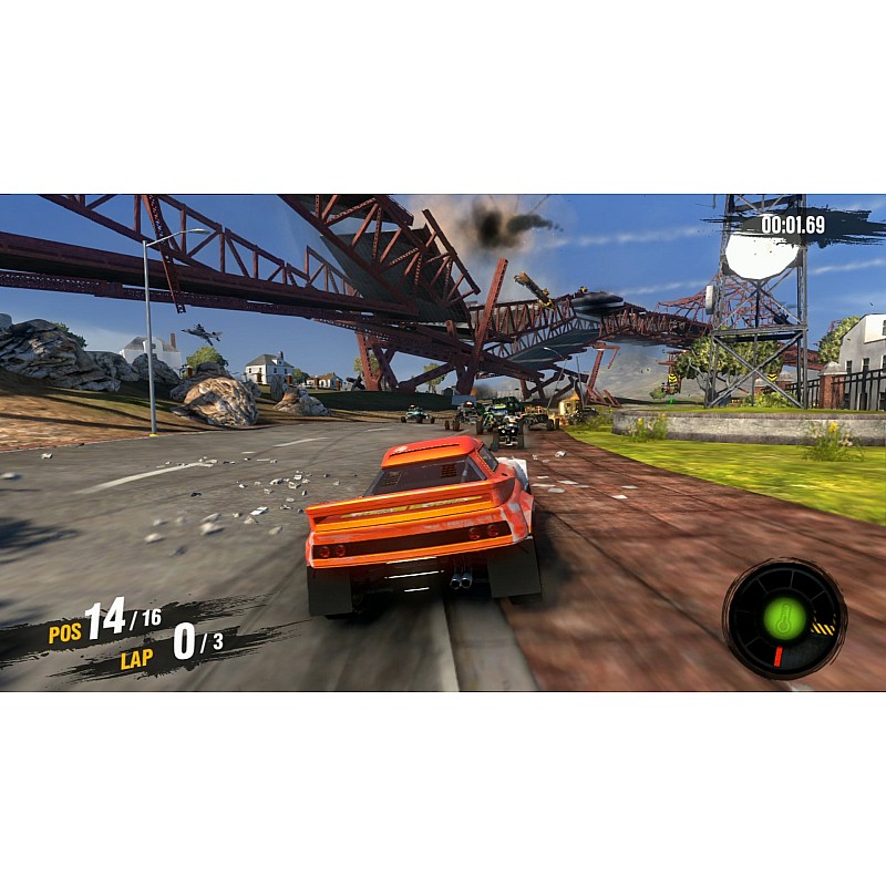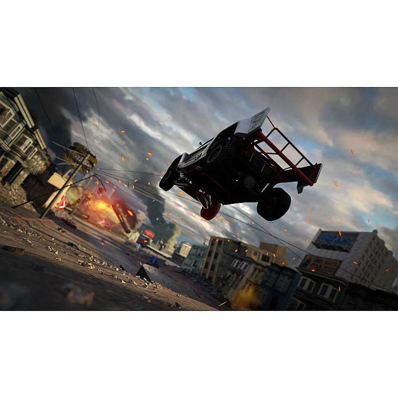 Plin de zgârie-nori instabili, tuneluri de metrou înflăcărate, poduri întortocheate și clădiri care se prăbușesc, orașul aproape complet abandonat oferă terenul de joacă perfect pentru cursele de stradă brutale marca electrică a lui MotorStorm.
