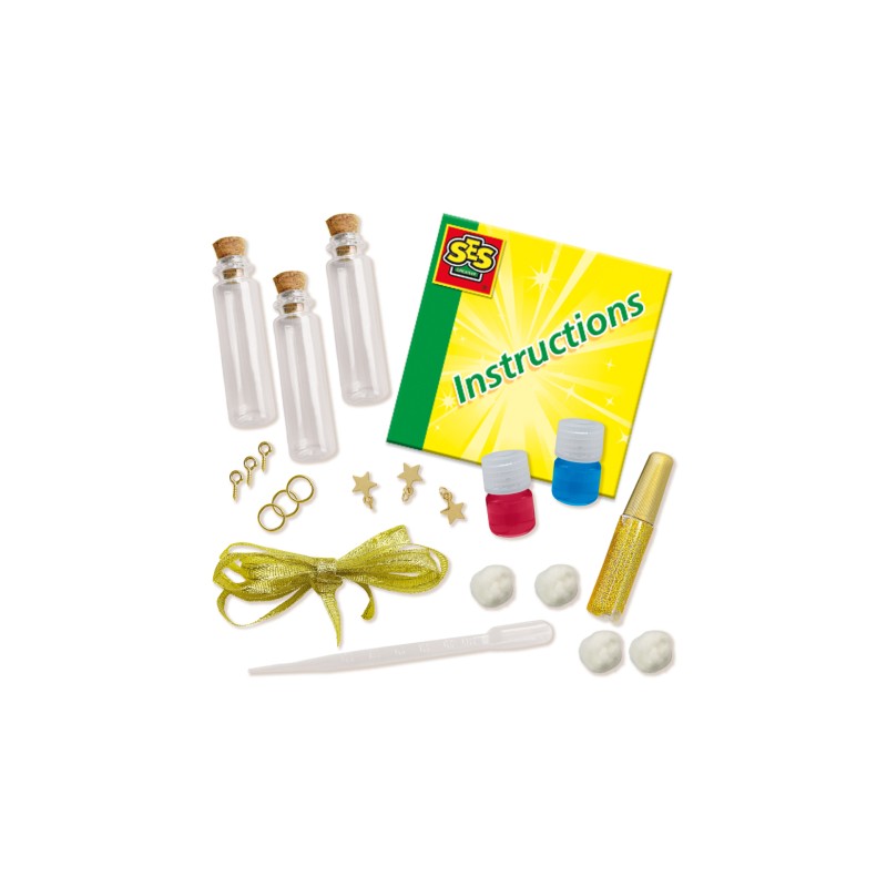 Setul contine 3 sticle mini cu dopuri de plută, 3 pandantive stea, 3 ochiuri, 3 cârlige pentru ochi, colorant roșu si albastru, lipici cu sclipici auriu, bile de bumbac, panglică aurie, o pipetă si instrucțiuni.