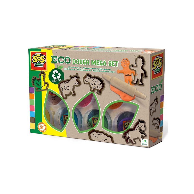 Contine: plastilina galbena; plastilina verde; plastilina rosie; plastilina albastra; plastilina maro; plastilina portocalie; plastilina violet; cutite in forma de ferma (plastic reciclat); sucitor din lemn.