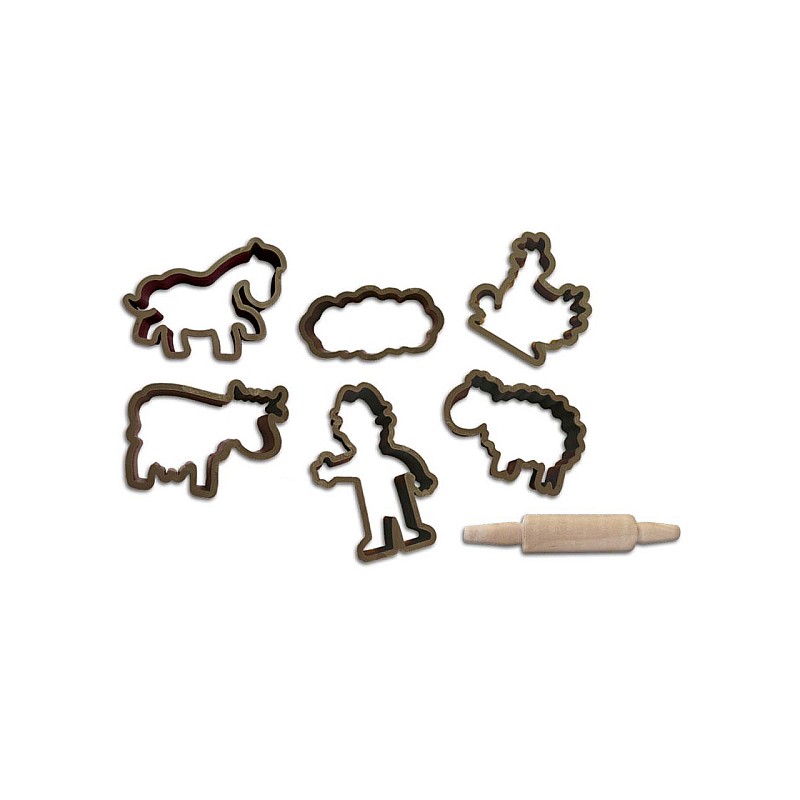 Acest set contine sapte culori diferite de plastilina, un sucitor de lemn si diferite forme de ferma, de taiat.