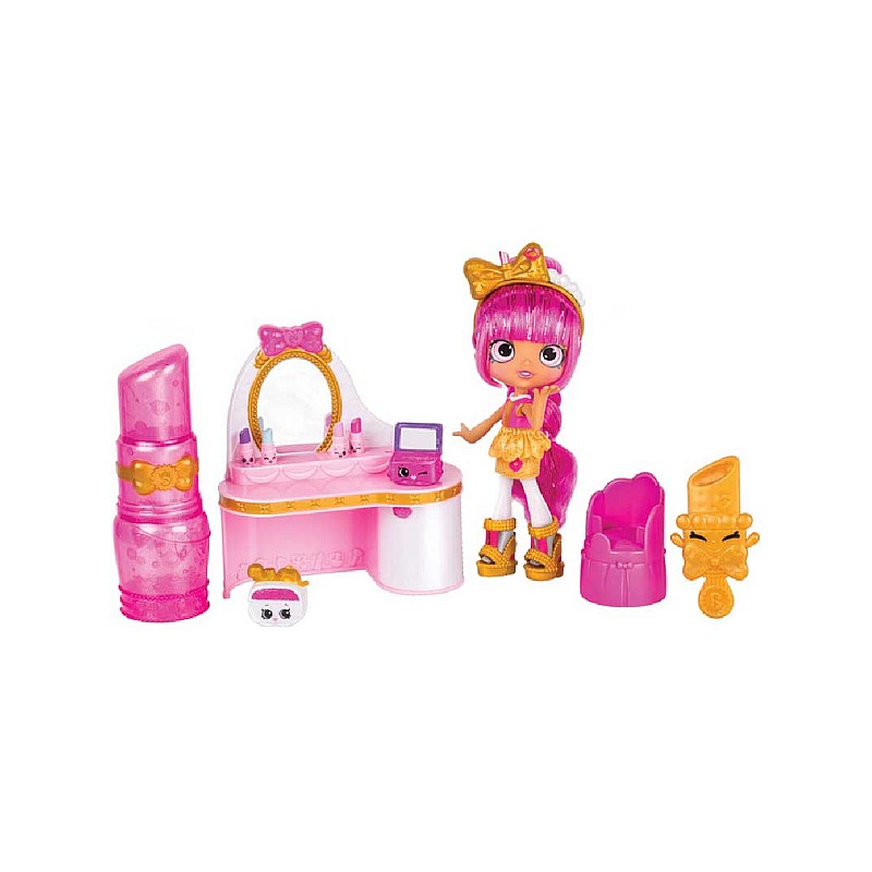 Setul de joacă include o masă și un scaun de toaletă, o vitrină de ruj, 2 personaje Shopkins și 4 mini Shopkins, o perie și un elastic de păr - tot ce este necesar pentru a te pregăti pentru o petrecere.