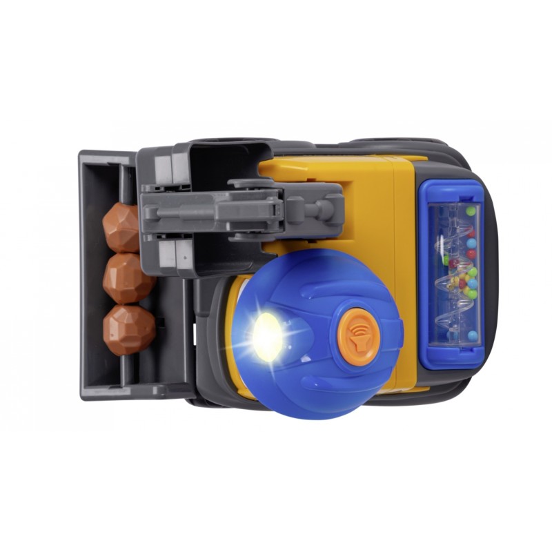 Lampa strălucitoare de pe cască și vocea amuzantă care imită diverse zgomote ale vehiculului completează experiența interactivă. Necesită 3 x baterii AA (R6) de 1,5 V (incluse).