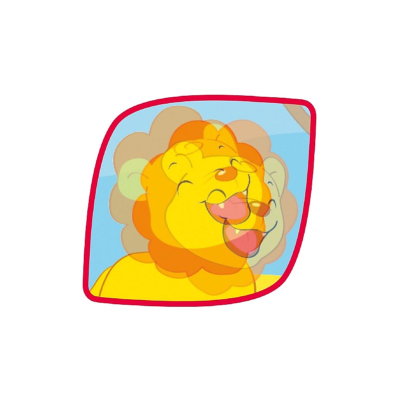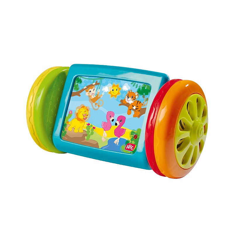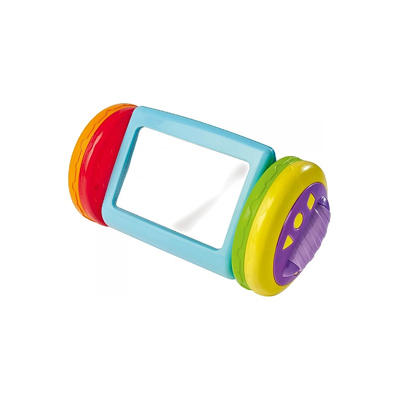Piesa centrala are o oglinda colorata pe o parte iar pe cealalta parte o imagine cu animale dragute, care pot fi rulate inainte si inapoi prin cele doua roti cu sunete