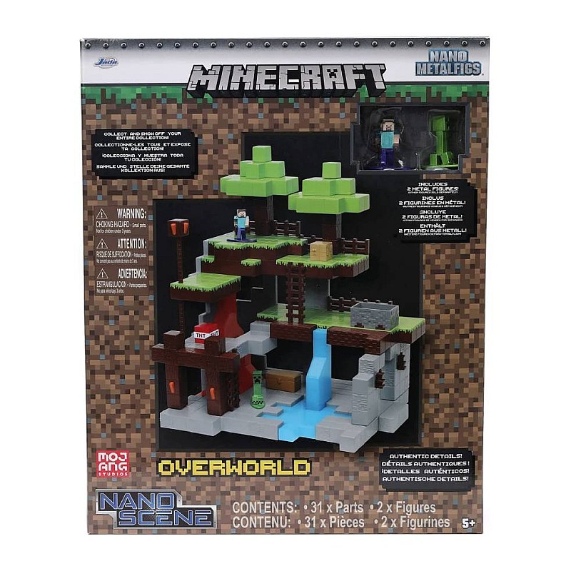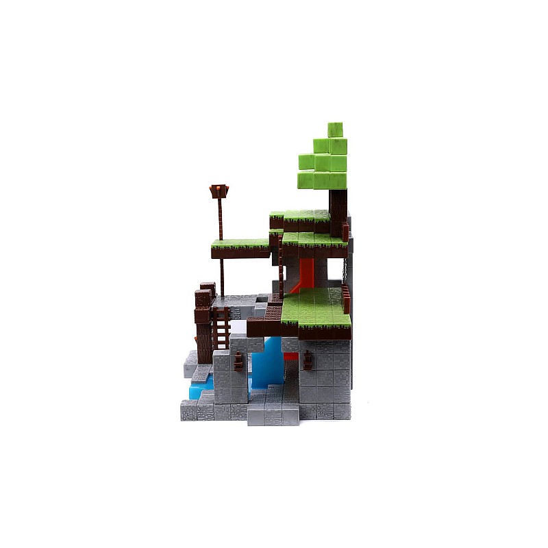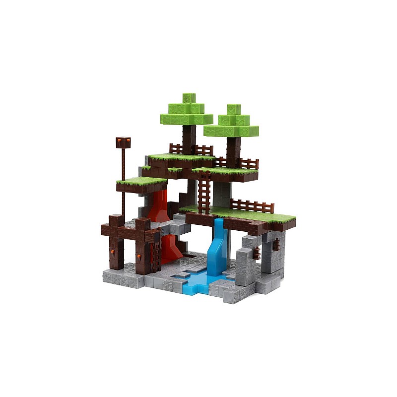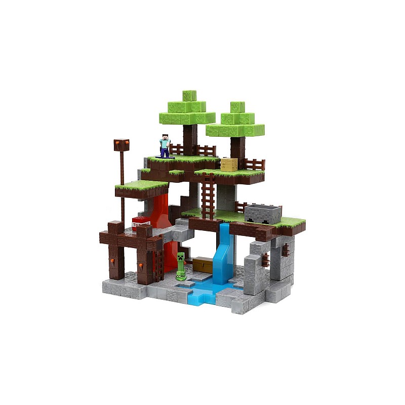Cu mai multe niveluri, lac, cascadă, copaci, scări și multe altele. Setul vine cu un cufăr de deschidere, un Minecart, o masă de meșteșugărit, TNT și două Nano MetalFigs 100% turnate sub presiune.