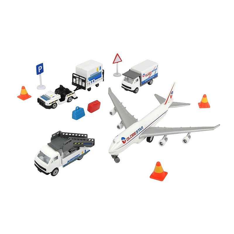 Acest set include un avion turnat sub presiune de 18 cm lungime, împreună cu 3 vehicule de sprijin la sol, panouri și accesorii.