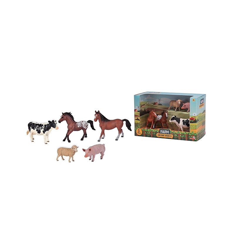 Setul de joacă include 5 animale diferite: cal în picioare, cal în galop, oaie, porc și vacă.