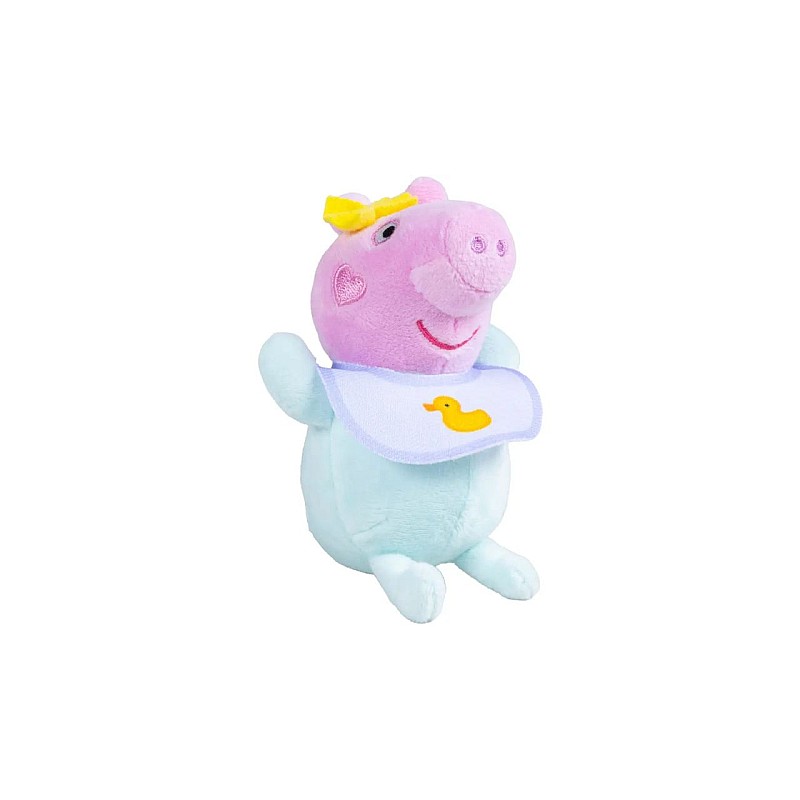 Poartă o rochie portocalie veselă și are un rucsac special în care stă Baby Peppa.