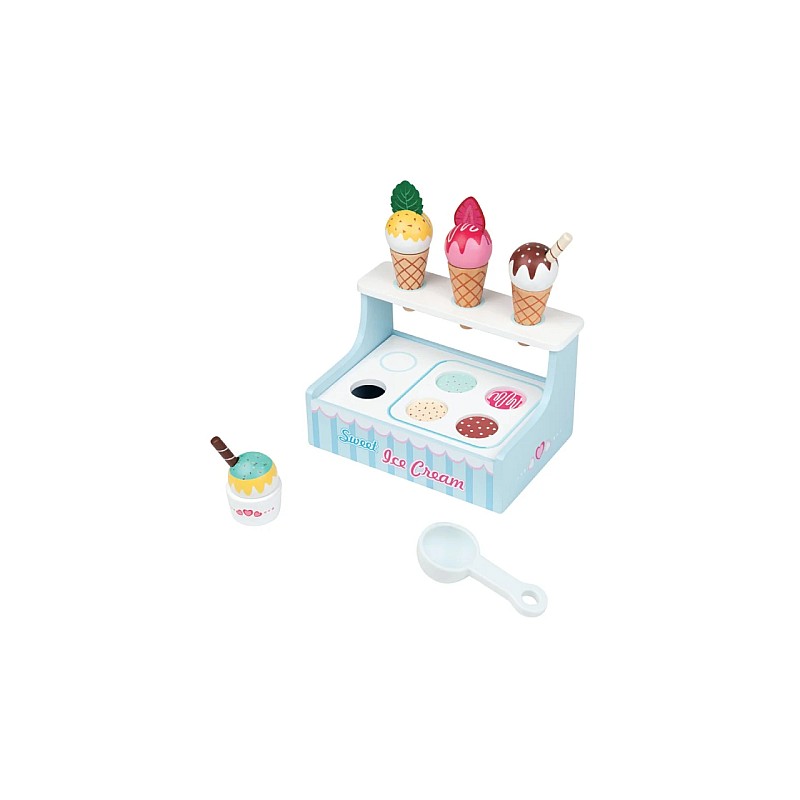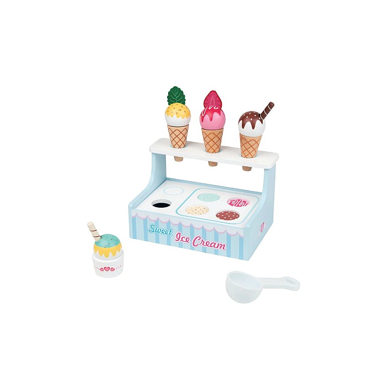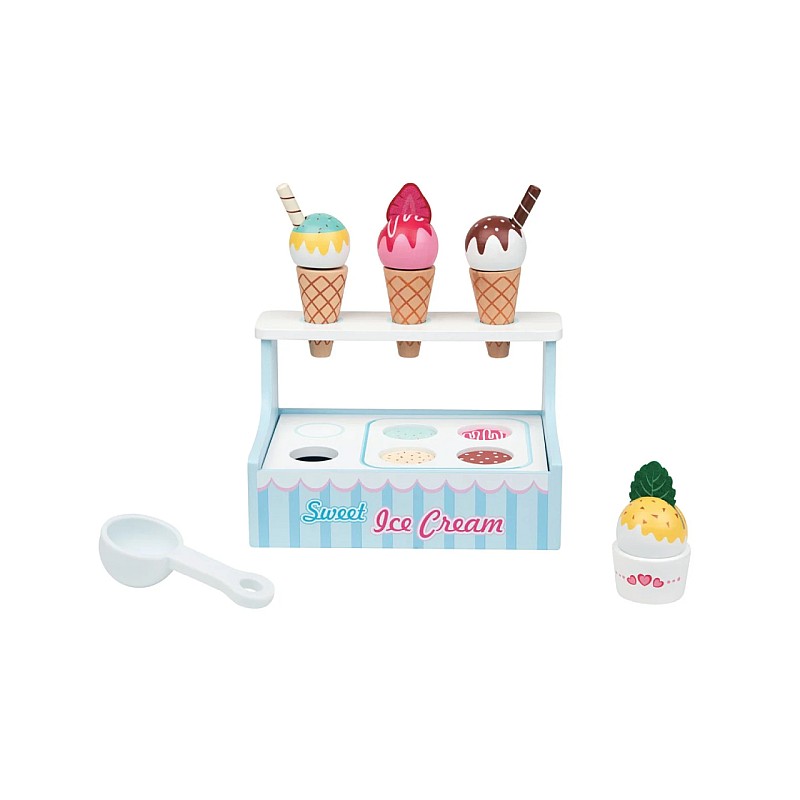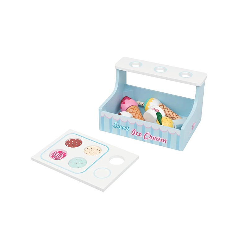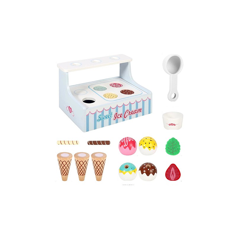 Acest încântător Mini magazin de înghețată din lemn include 4 înghețate cu arome diferite, 3 conuri de vafe, 1 ceașcă, 4 topping-uri diferite pentru decorarea înghețatei, 1 lingură și un contor de înghețată cu capac detașabil.