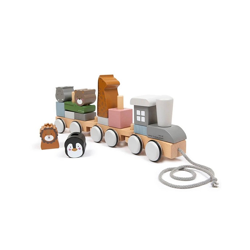 Blocurile au o gaură în mijloc pentru a putea fi stivuite pe grămezi. Trenulețul are roți mici și o sfoară lungă, astfel încât copilul să îl poată trage după el.