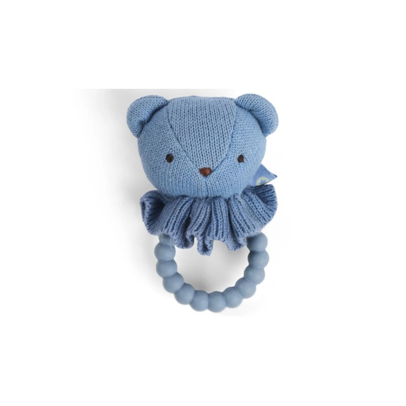 Frumos Smallstuff rattle teether în albastru în formă de cap de urs în calitate tricotată.