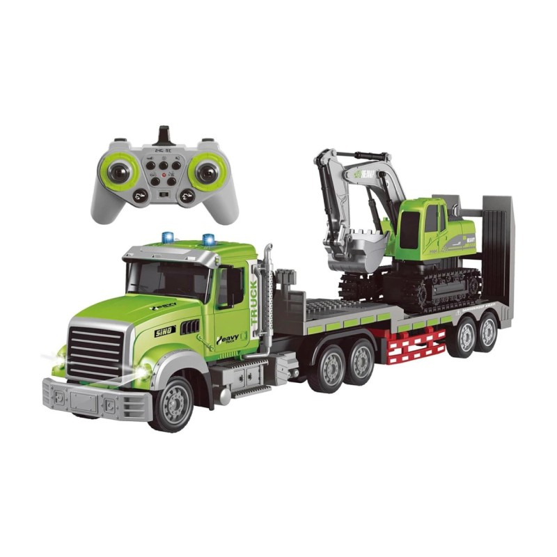Acesta este un camion și excavator radiocomandat 2 în 1. Acest camion telecomandat la scara 1:12 măsoară 24 inch în lungime și vine cu un excavator telecomandat.