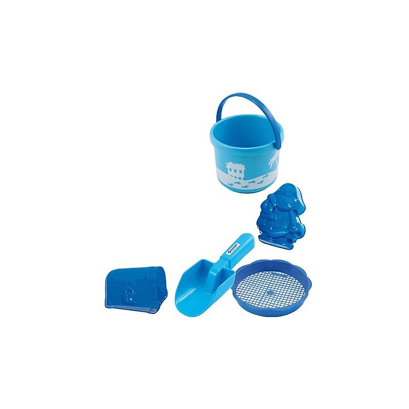 Setul contine 5 piese în nuanțe de albastru: găleată și lopată, 2 forme de nisip și 1 sită.