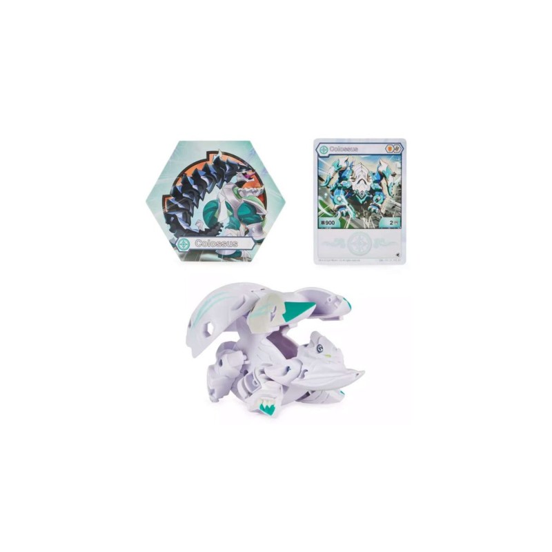 Setul Deka Bakugan Colossus conține o minge albă și albastră, o carte de personaj și un Deka BacuCore.