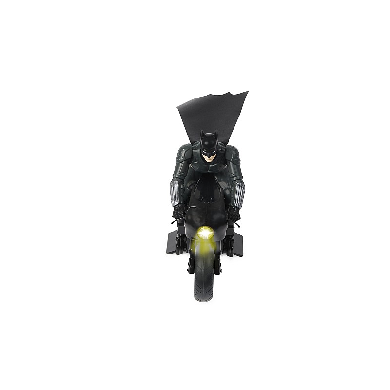 Motocicleta Batcycle radiocomandată include Batman atașat la scaunul șoferului cu o pelerină din pânză.