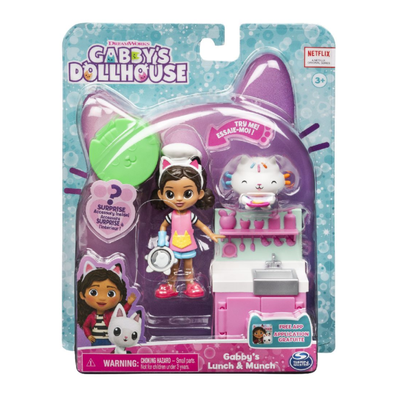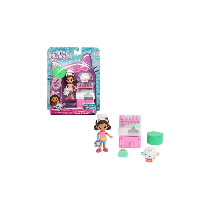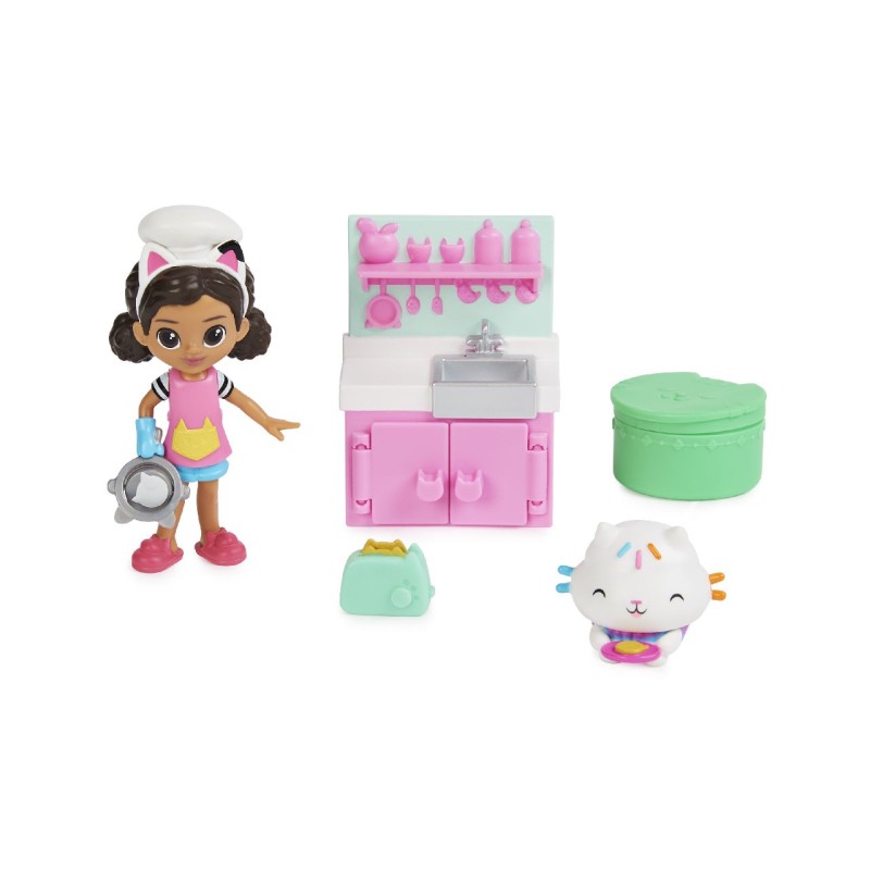 Acest set de jucării amuzante include o figurină Gabby Girl de 5 cm, o figurină de pisică Cakey, o unitate de bucătărie și un pachet pentru casa de păpuși care conține un accesoriu de bucătărie surpriză.