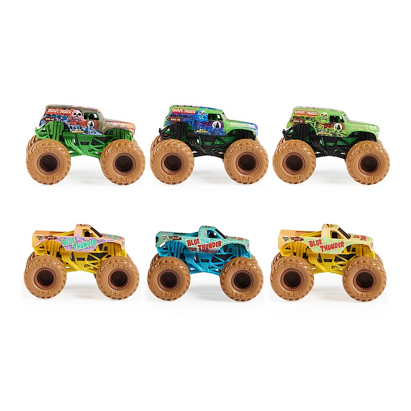 Acest pachet de 2, cu Grave Digger și Blue Thunder (modelele vor varia), se spală pentru a dezvălui grafica detaliată a camioanelor tale preferate Monster Jam.