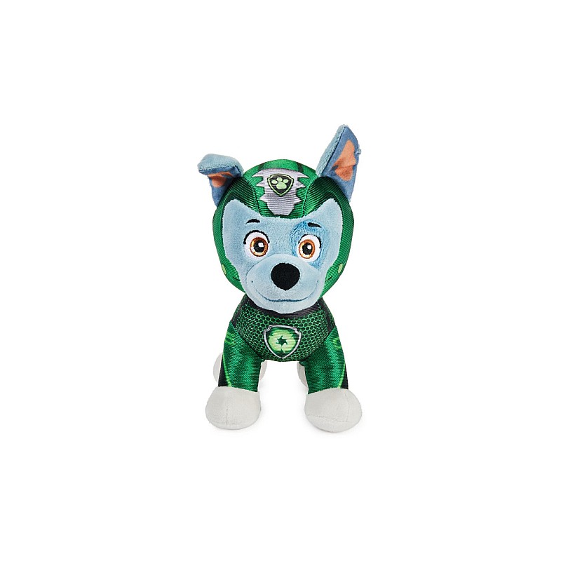 Purtând uniforma verde Aqua Pup, cu casca și insigna PAW Patrol, Rocky arată exact ca în serial!