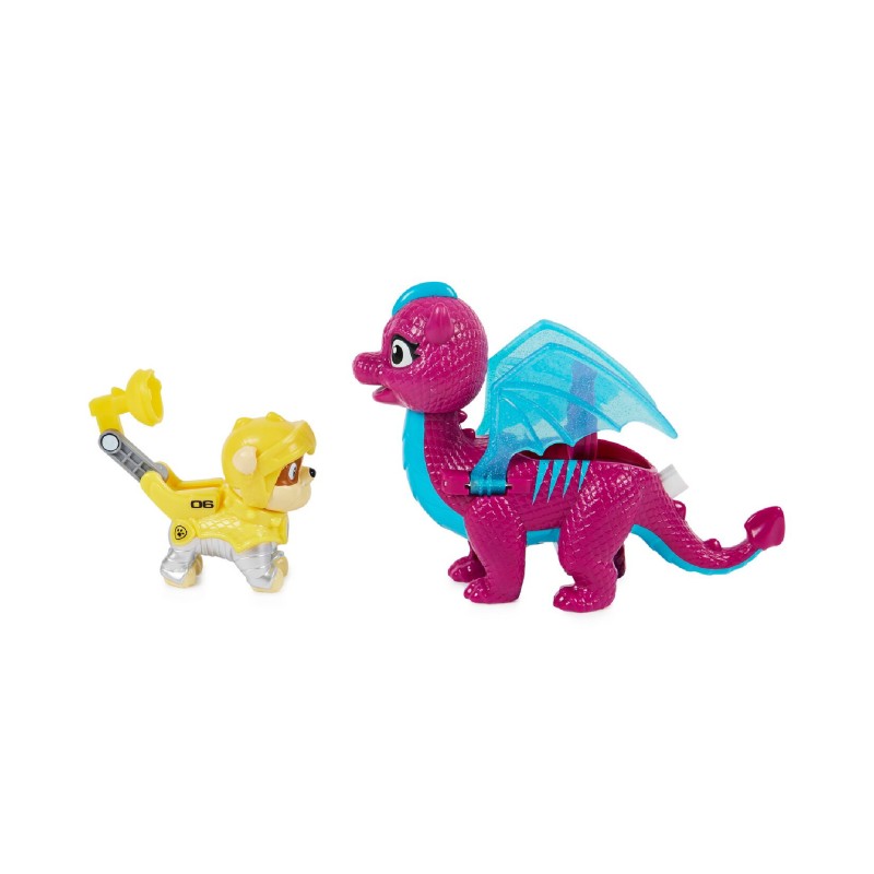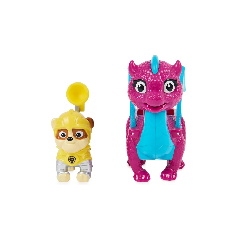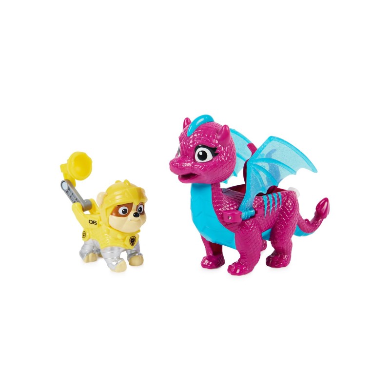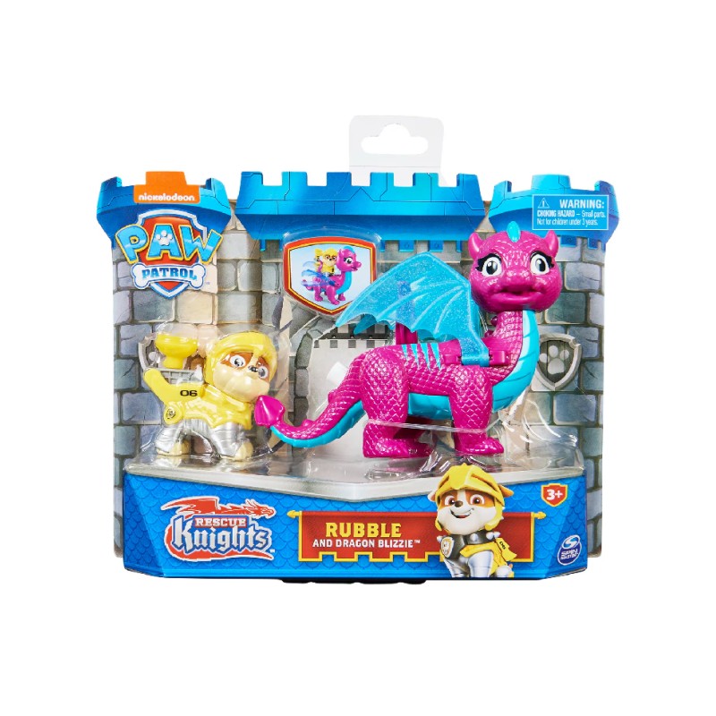 Acest set de figurine de acțiune include pe Rubble și pe prietenul său dragon de încredere Blizzie. Purtând armura Rescue Knights, îndrăgitul cățeluș al Patrulei PAW este gata să sară în acțiune.
