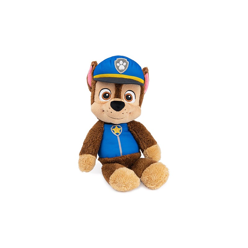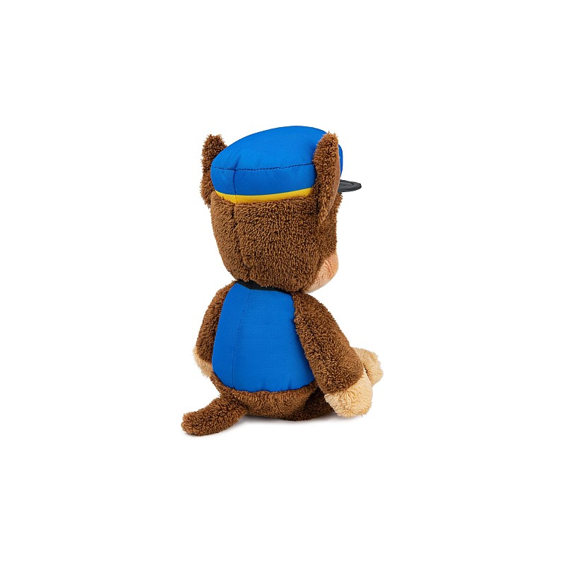 Acest pluș de 32 cm îl prezintă pe Chase în uniforma sa albastră de câine polițist, cu pălărie, insignă PAW Patrol și pluș moale maro.