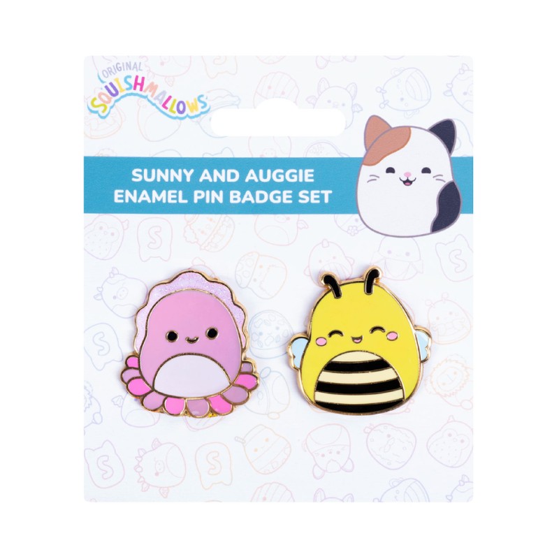 Aduceți un strop de magie Squishmallow accesoriilor dvs. cu setul de insigne emailate Sunny și Auggie.