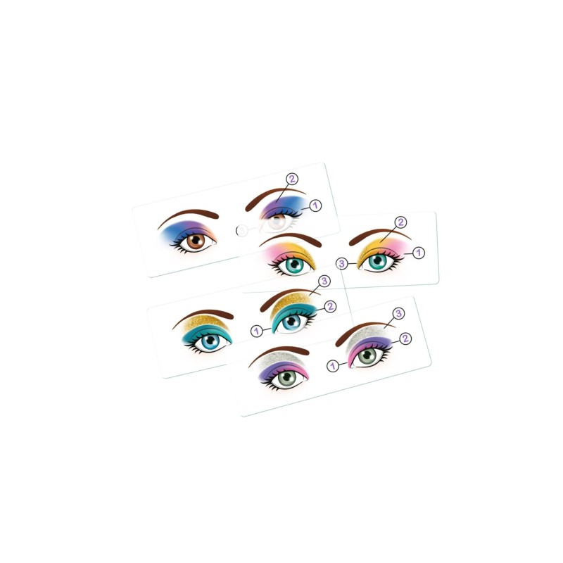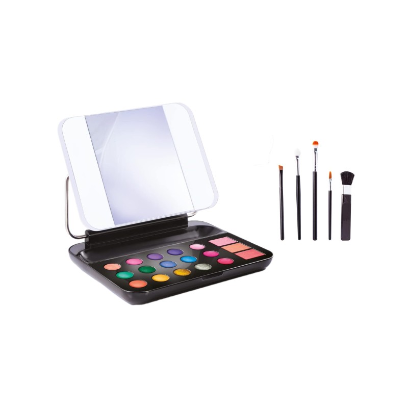 Include o trusă de machiaj cu 12 farduri de ochi (inclusiv 2 cu sclipici), 3 luciuri de buze și 5 pensule diferite.
