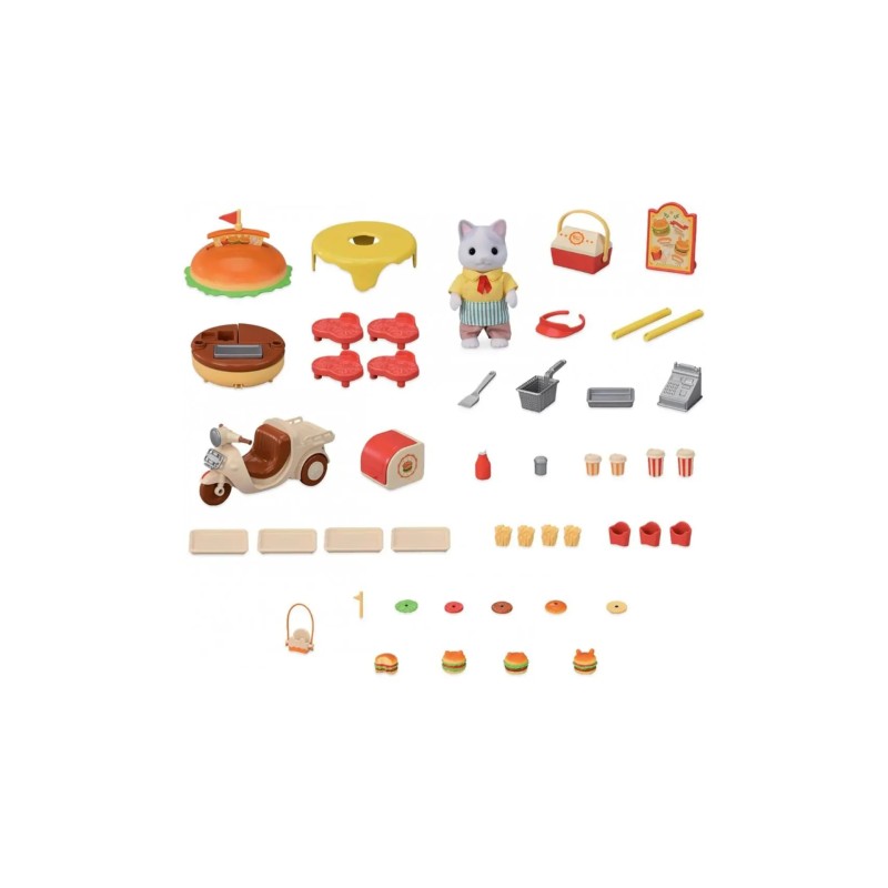 Această jucărie pentru copii conține toate accesoriile necesare pentru a finaliza toate etapele de preparare a unui hamburger.