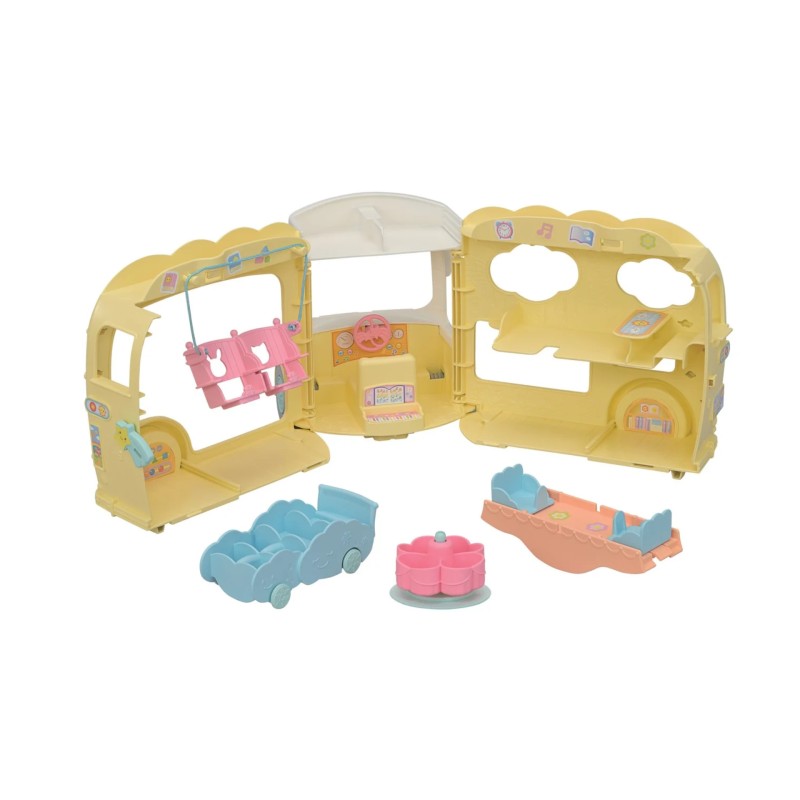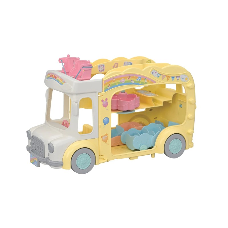 Rainbow Fun Nursery Bus este un autobuz cu trei etaje care se pliază într-un parc de joacă cu mai multe funcții. Scaunele se transformă într-un carusel, leagăn, tobogan, balansoar și cărucior pentru copii.