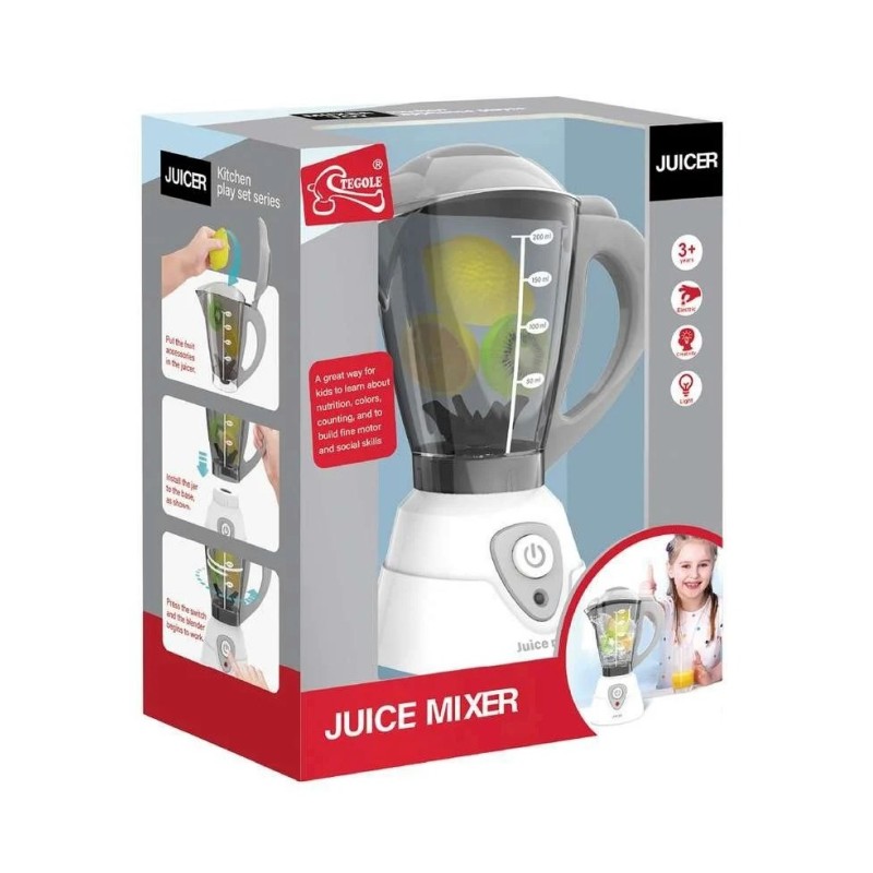 Setul este format din: 1 pahar de blender cu "cuțit" și capac, bază cu motor și 3 bucăți de fructe.