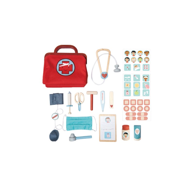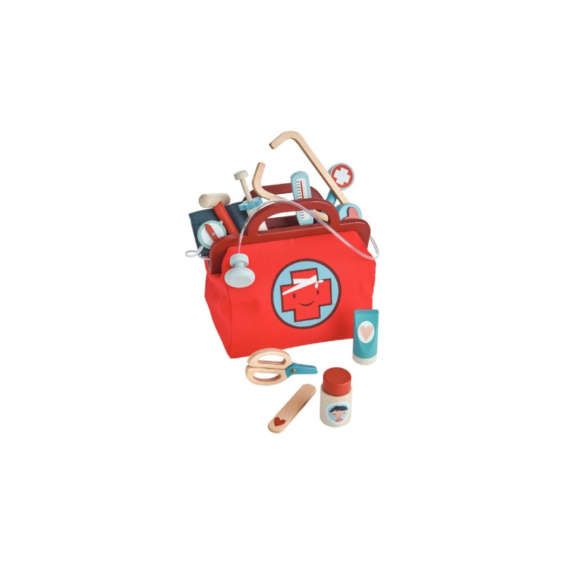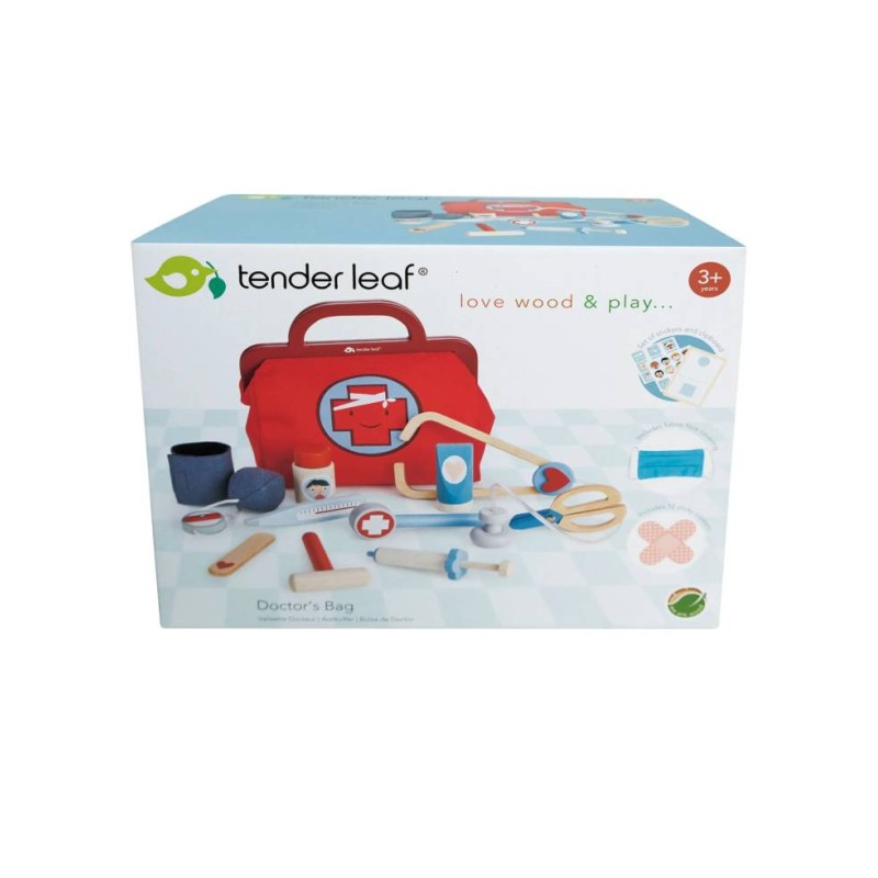 Geanta de doctor din pânză și lemn are un stil retro și conține toate elementele esențiale pentru tratarea pacienților.