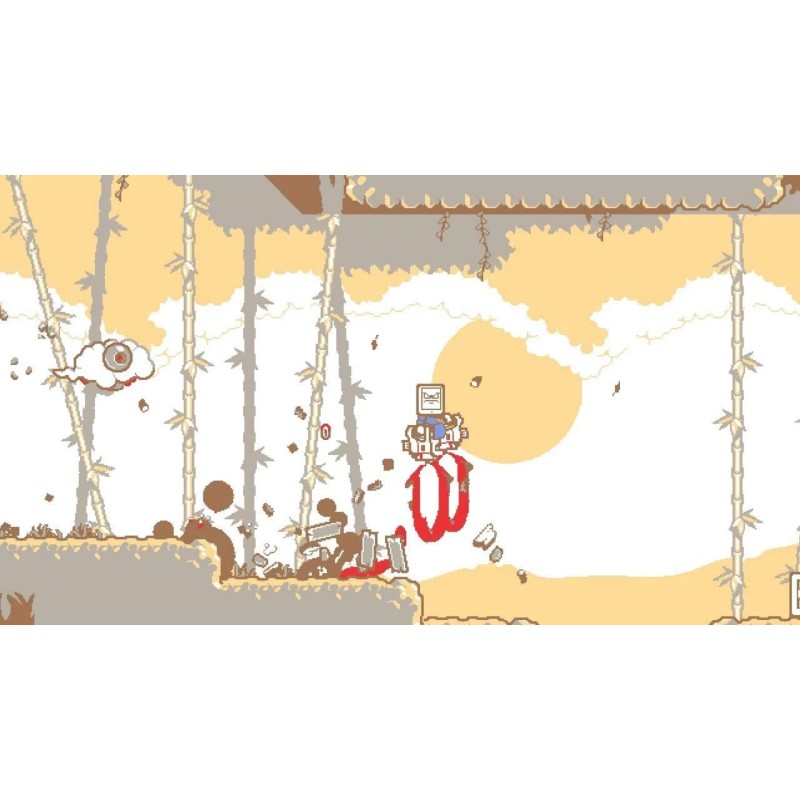 Explorează diferitele medii pixel-art din KUNAI, fiecare cu o paletă minimalistă, în timp ce Tabby face fețe drăguțe.