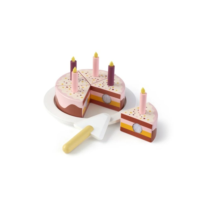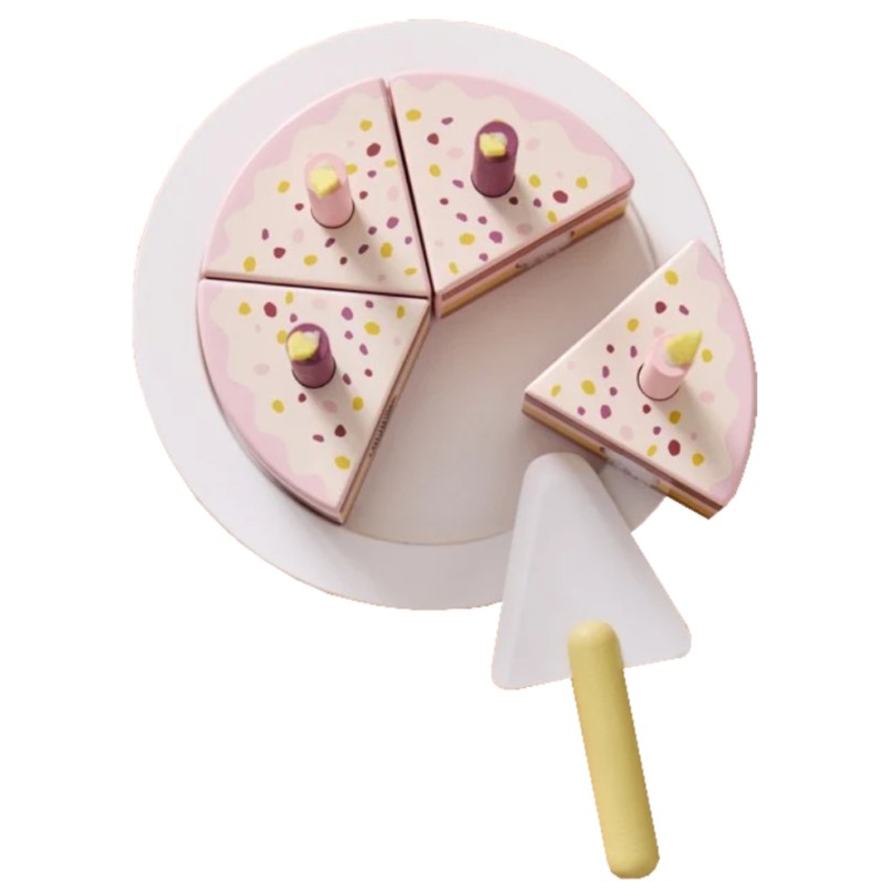Acest set vibrant de mâncare pentru joacă include o farfurie de servire, o spatulă și 5 bucăți de tort ținute împreună cu velcro.