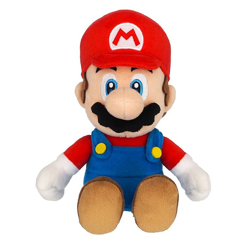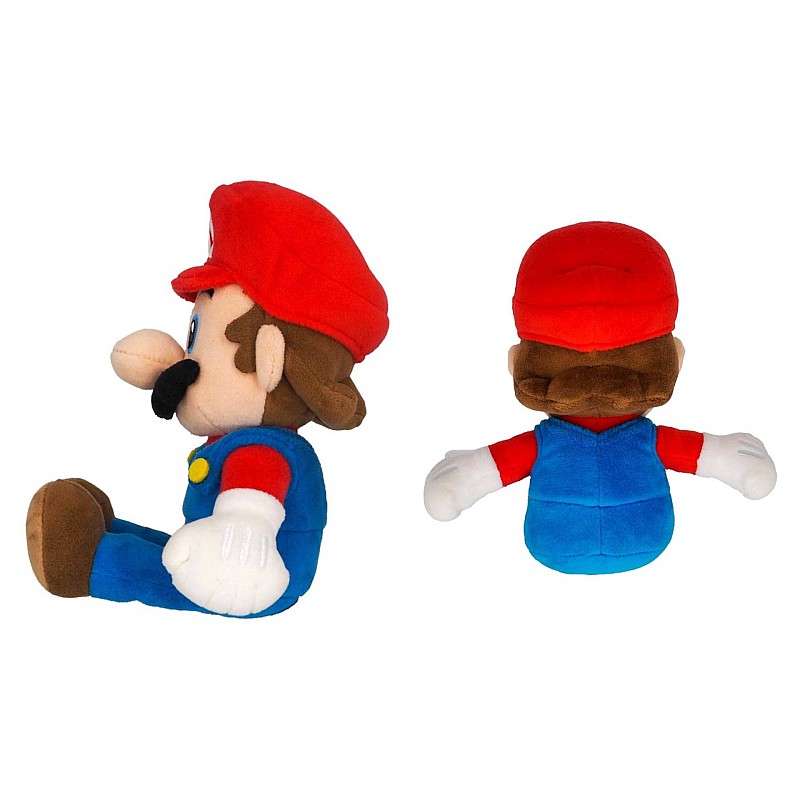 Culorile vibrante și detaliile plușului Mario îi aduc un omagiu celebrului instalator italian, de la salopeta sa albastră până la șapca roșie împodobită cu litera M.