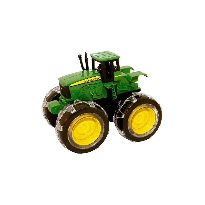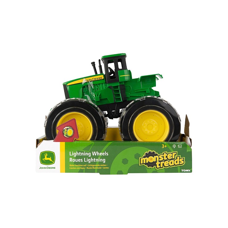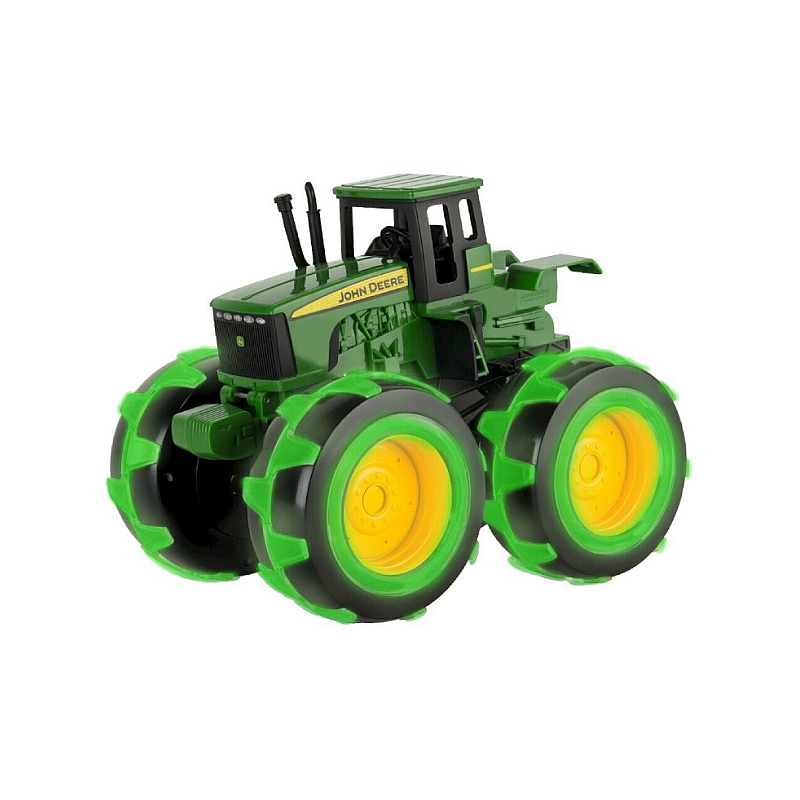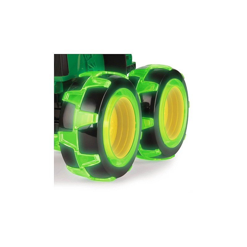 Tractorul John Deere Monster Light Up cu anvelope de 20 cm este un vehicul masiv. Luminile LED verzi se activează atunci când vehiculul rulează