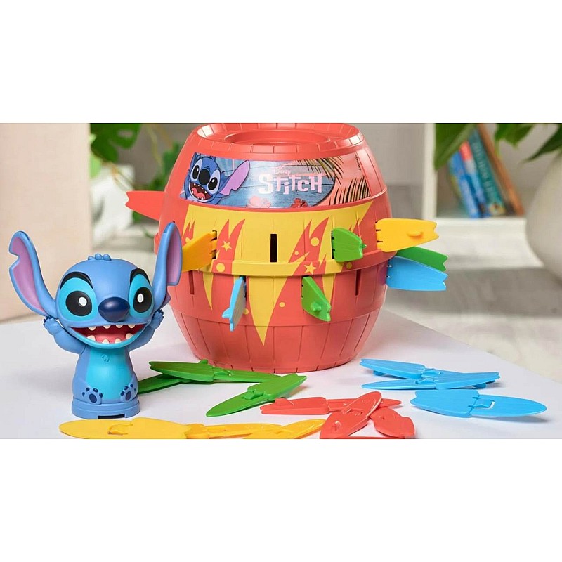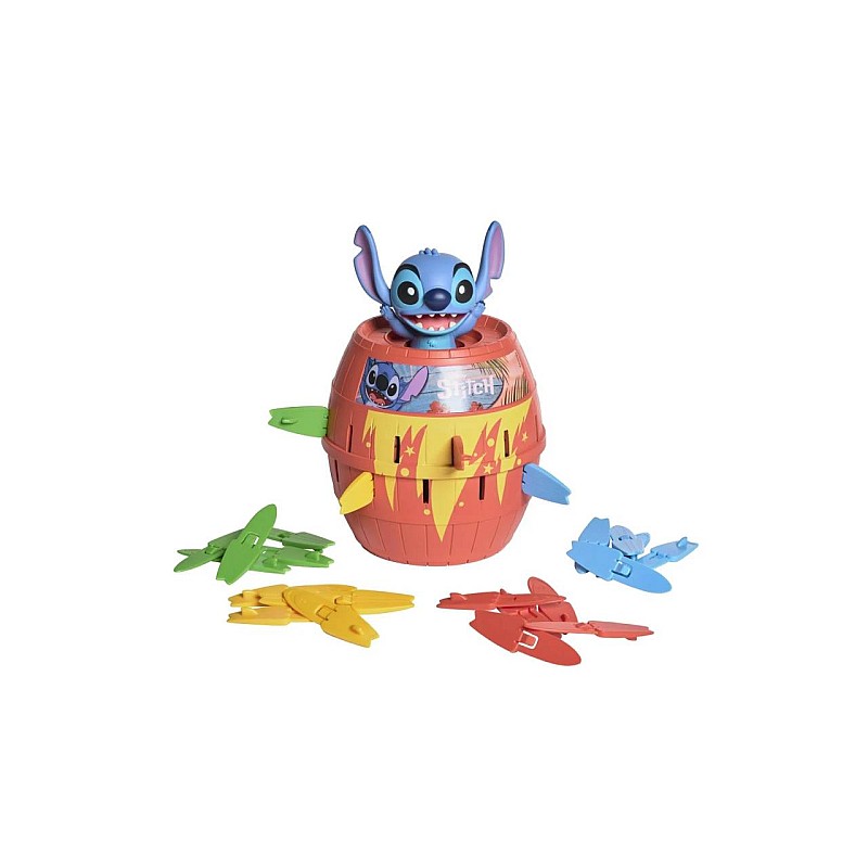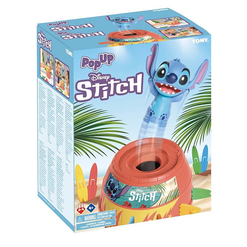 Include: 1 figurină Stitch, 1 butoi, 24 de plăci de surf și reguli simple. Seria de jocuri de societate Pop-Up de la TOMY este potrivită pentru 2-4 jucători sau echipe.