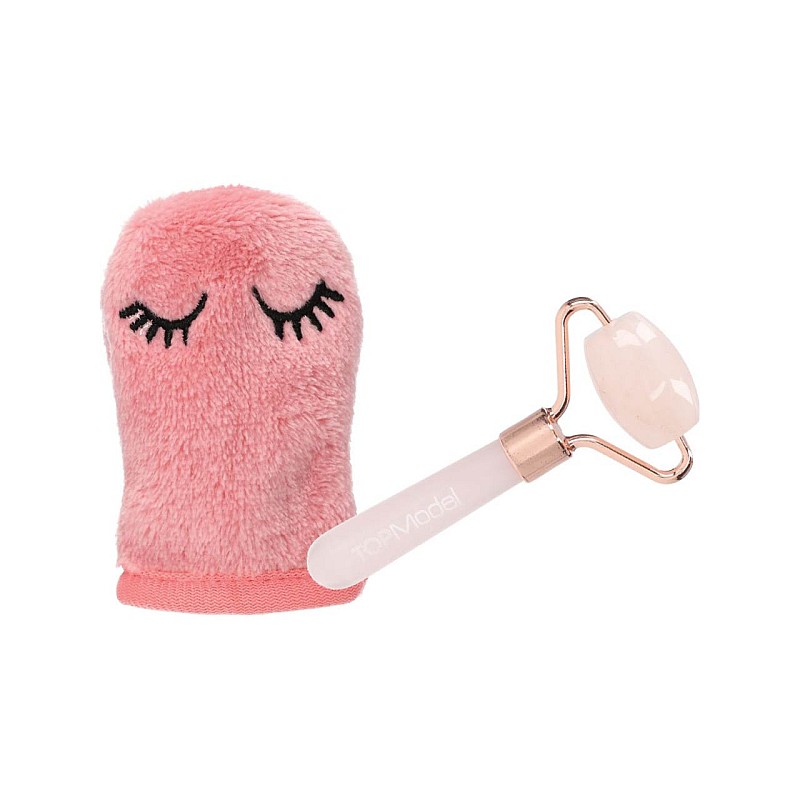 Setul include și o mănușă de înfrumusețare roz pal cu ochișori adorabili pentru dormit, pentru spălarea feței.