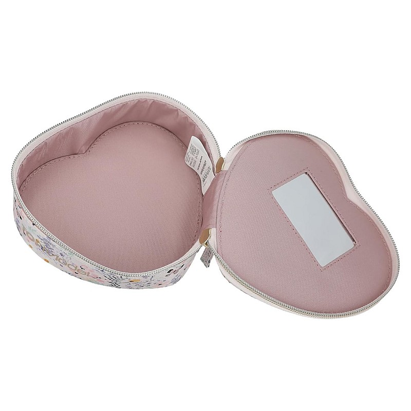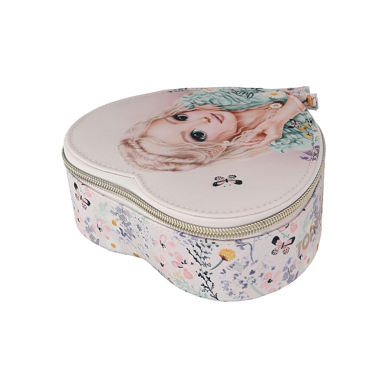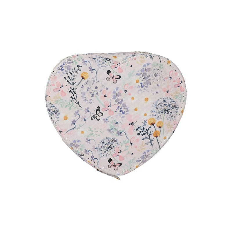 Cutia de bijuterii TOPModel în formă de inimă cu fermoar are un motiv romantic de model pe capac și un model drăguț de flori delicate și fluturi în jur.