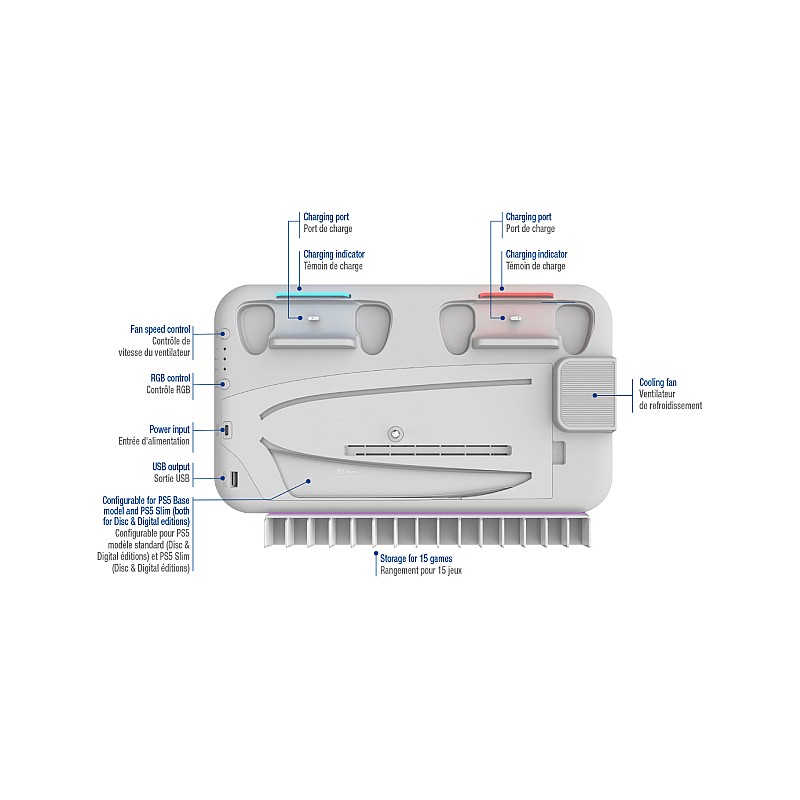 Stație multifuncțională de răcire și încărcare pentru modelul de bază PS5 și PS5 Slim (pentru edițiile Disc și Digital)