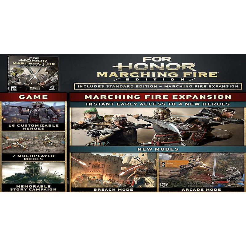 Include jocul de bază For Honor, plus Expansiunea focului de marș. Alegeți între facțiunea dvs. și jucați în campaniile PvP, PVE, cooperativă și poveste.