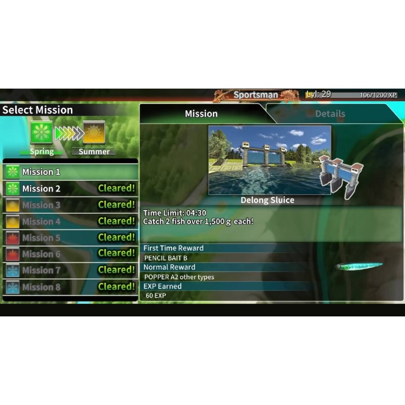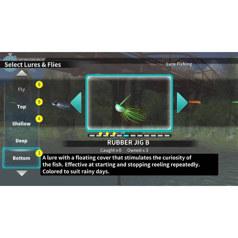 - Colectați 21 de tipuri de pești, inclusiv câțiva pești de mărime „legendară”, precum și 11 undițe și 11 mulinete, 48 de tipuri de momeală și 8 tipuri de naluci artificiale.