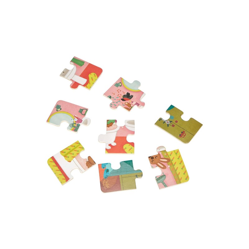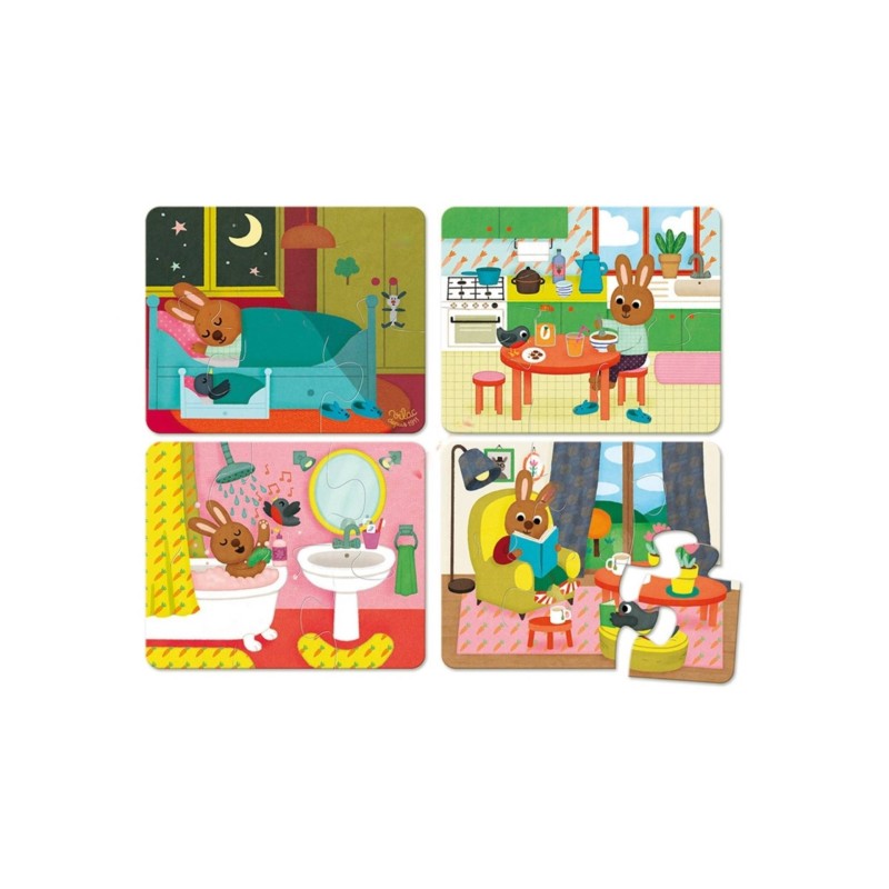 Pachetul contine 4 puzzle-uri de 6 piese din lemn cu tematică de casă.