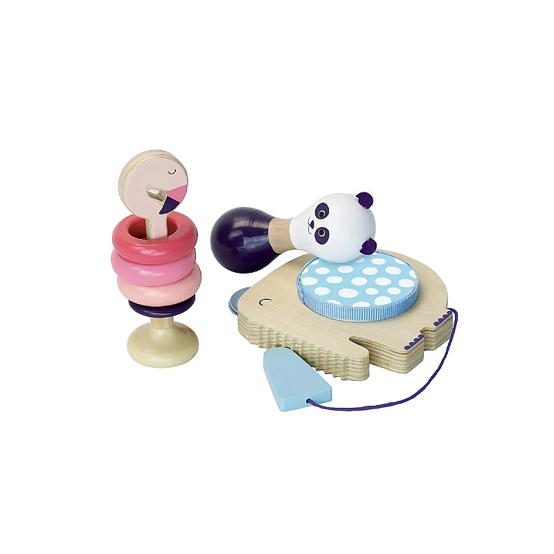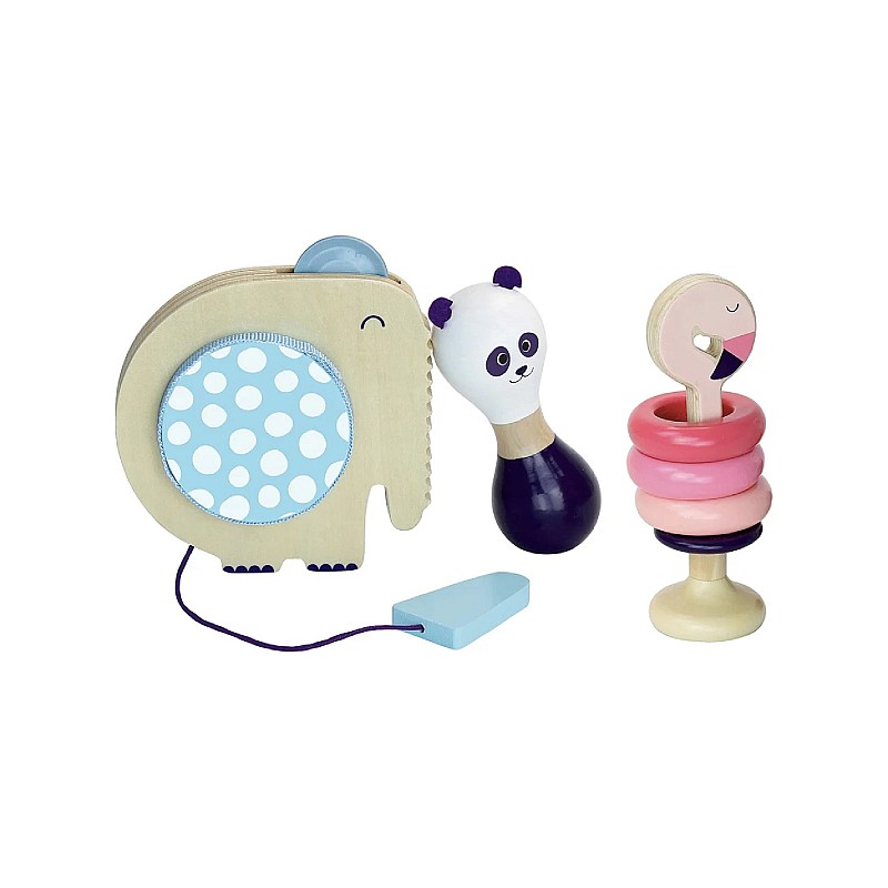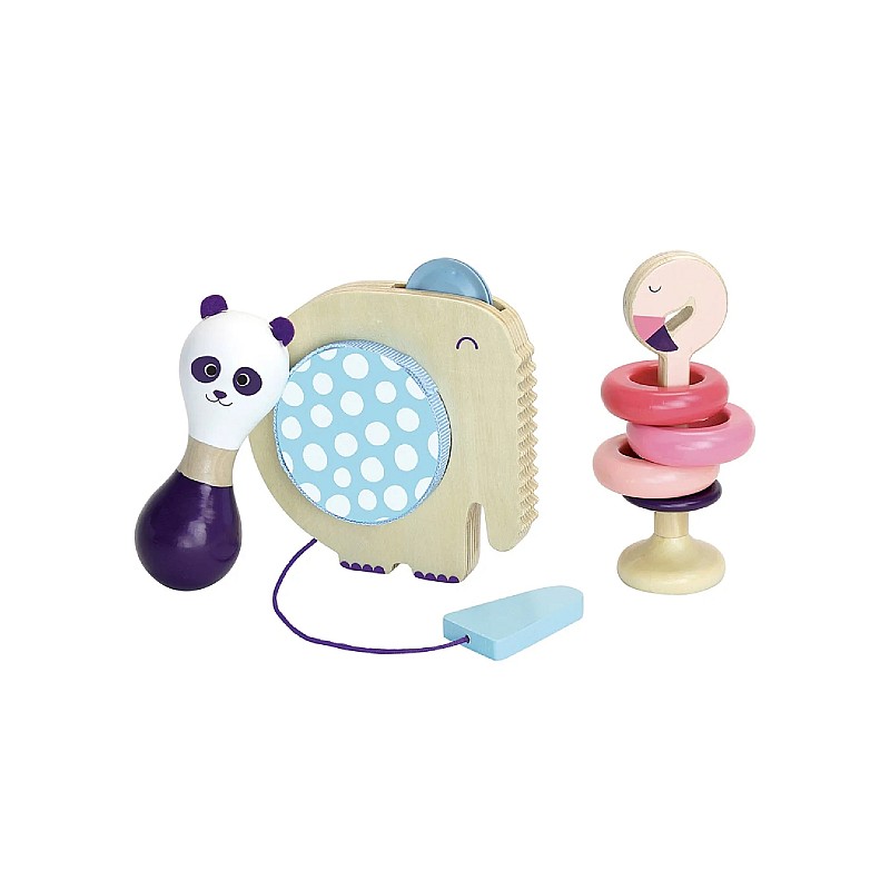 Acest set include o selecție de instrumente muzicale adaptate vârstei, precum un tamburin, maracas și un xilofon, toate realizate din lemn de înaltă calitate și finisate cu vopsele sigure, non-toxice.