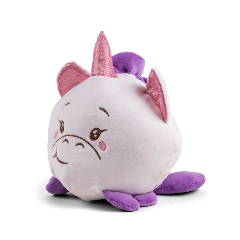 Unicorn de pluș cu o textură moale, ideal ca decor pentru cameră sau pat.