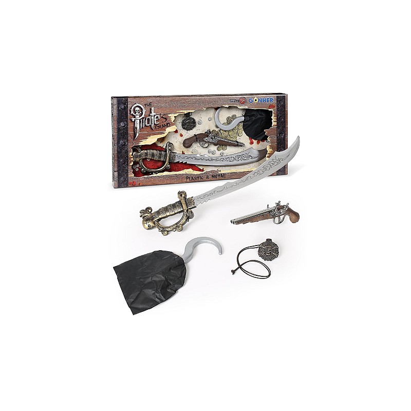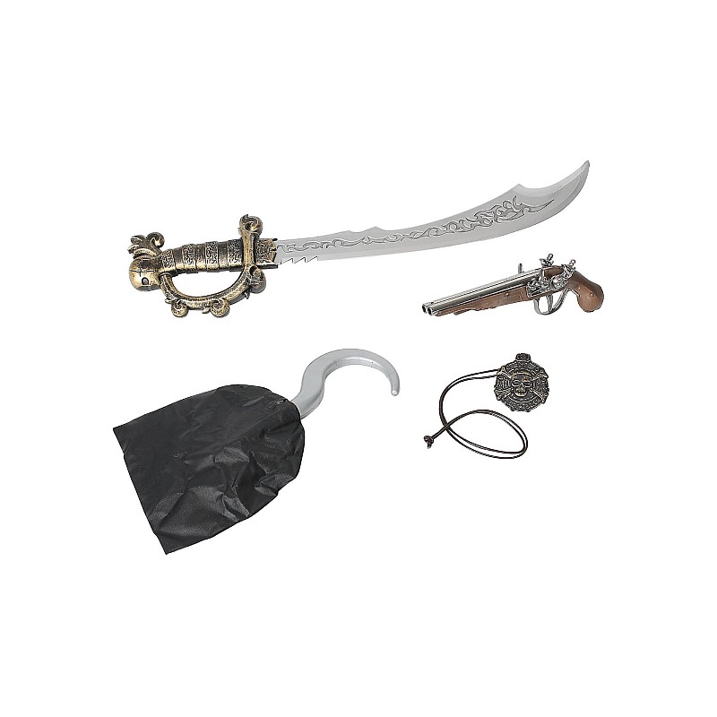 O sabie de pirat, un medalion, un pistol cu cremene și un cârlig. Se trage cu sunet, nu este nevoie de muniție.