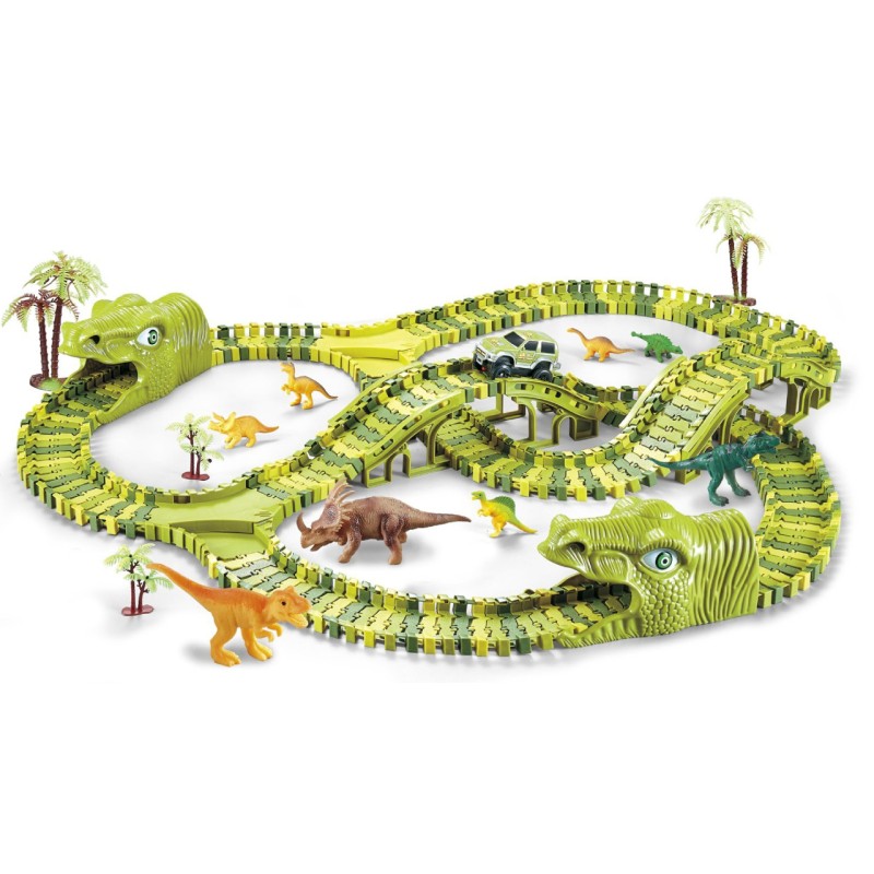 Setul include 240 de piese flexibile pentru pista de curse, 1 mașinuță dinozaur, 1 mașinuță, 6 modele de dinozauri, 4 copaci, 2 capete de dinozaur și 4 pante.