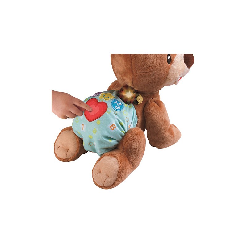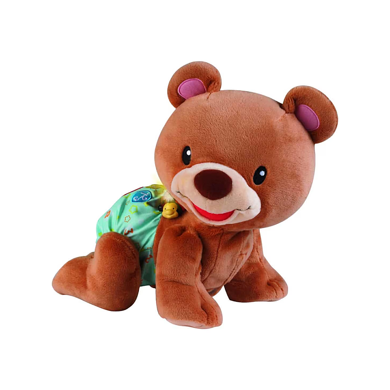 Când bebelușul l-a prins din urmă pe ursulețul care se târăște, există patru butoane care pot fi apăsate - iar ursulețul va vorbi despre culori și forme - și poate va cânta un cântecel.
