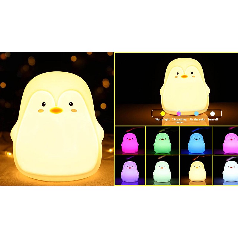 Îi puteți schimba modul prin atingerea suprafeței de silicon. Porniți butonul, această lampă pinguin intră în modul de lumină albă caldă.