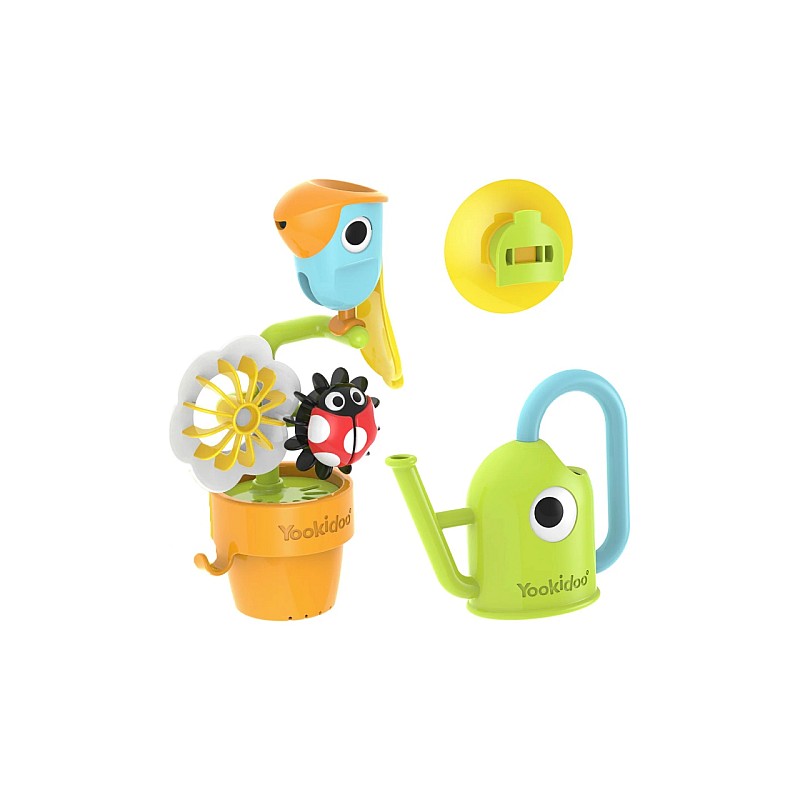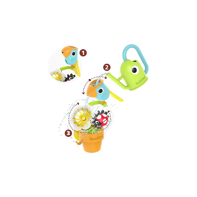 O jucărie pentru baie cu tematică de grădină, un ghiveci cu o pasăre care se răstoarnă, o floare care se învârte și o buburuză. Include și o stropitoare care poate fi folosită pentru a uda pasărea din vârful ghiveciului și a declanșa o reacție în lanț de distracție!